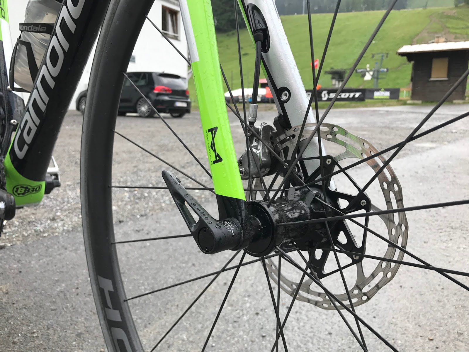 Patka přehazovačky slouží zároveň jako opora pro pevnou osu. Vzhledem k celkovému pojetí kola jsou montovány kazety s větším rozsahem 11-28 tubů a přehazovačky s delším vodítkem.